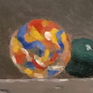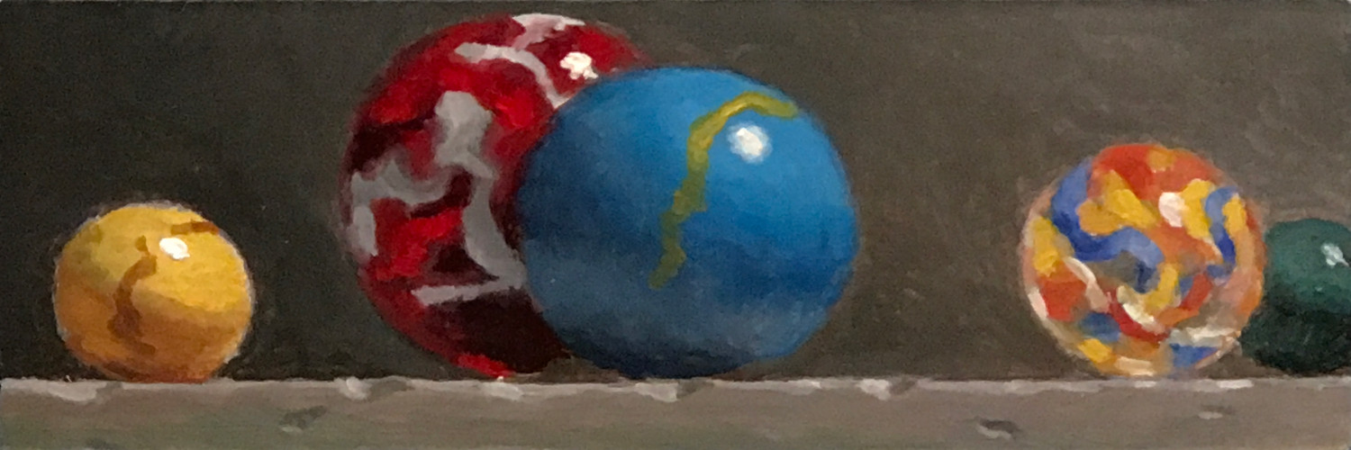A playful look at a family, this painting features a clan of marbles – all similar, each unique.