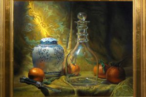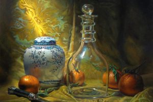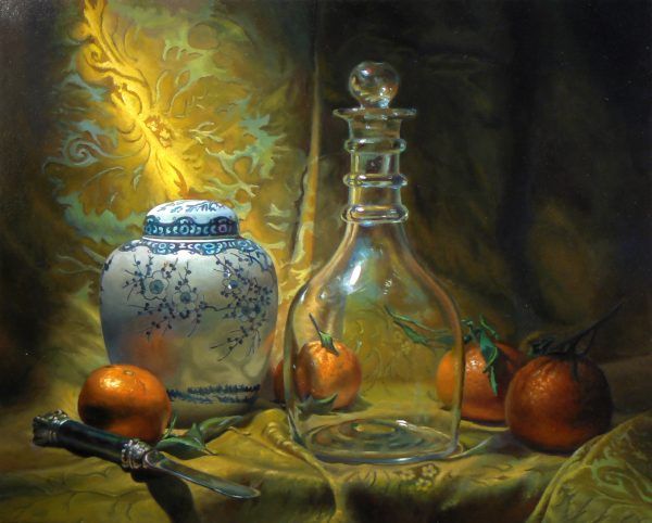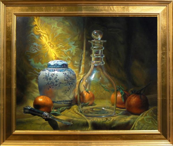 It features a dramatic beam of light illuminating a graceful scene, with a classic Chinese ginger jar, fine antique crystal decanter, and fresh oranges all resting on golden brocaded cloth.