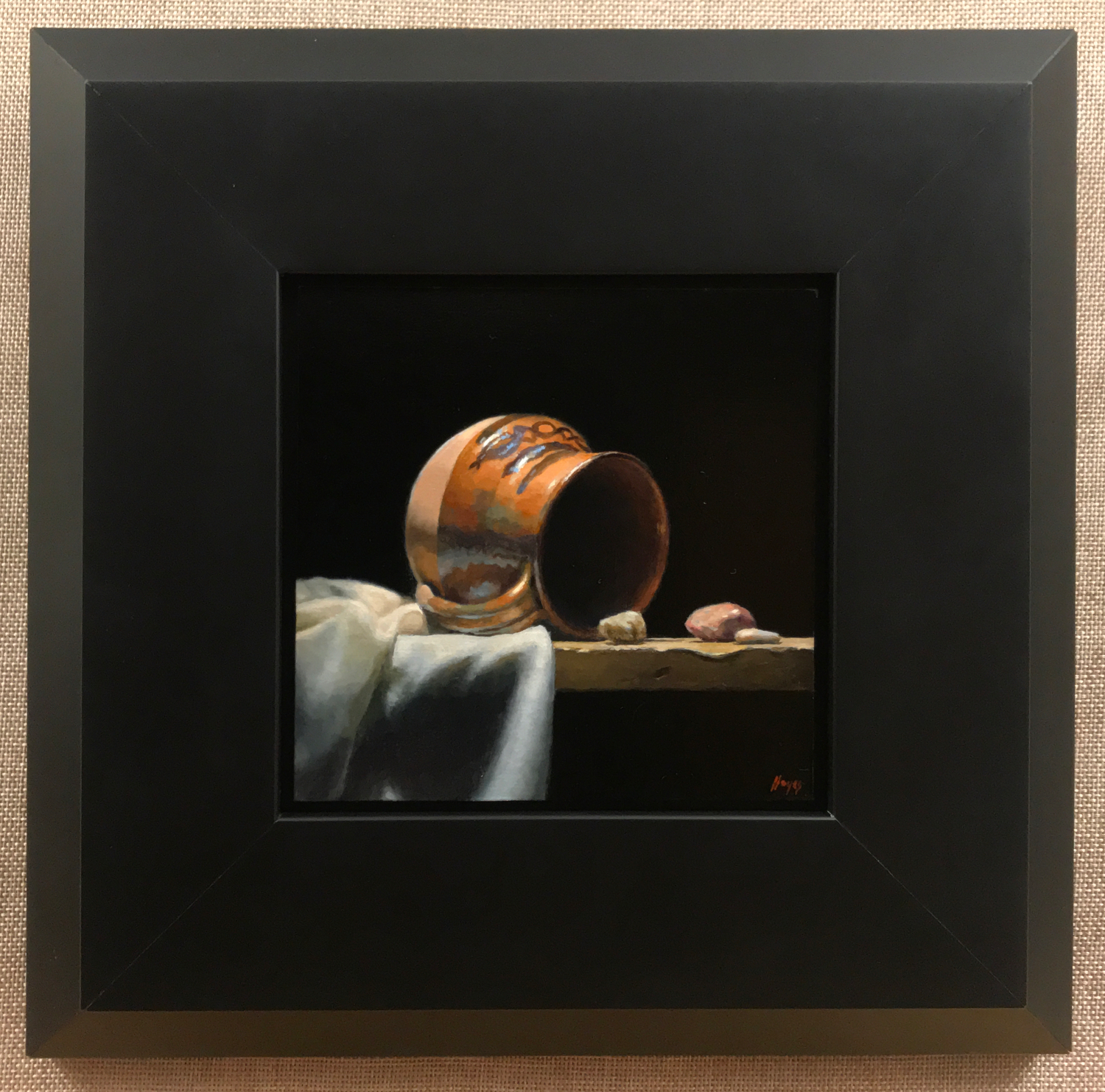 “Mexican Pitcher and River Stones” measures 5 x 5 inches (12 x 12 cm), and is presented in a flat panel black frame with a beveled edge. The outer dimensions of the frame are 11 x 11 inches (28 x 28 cm). Felt pads are affixed to each corner of the back of the frame to prevent any damage to your wall and to ensure that the painting rests perfectly parallel to the wall.