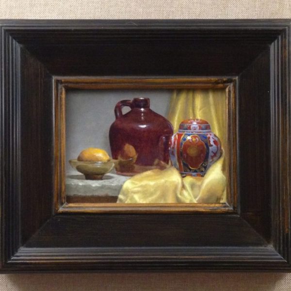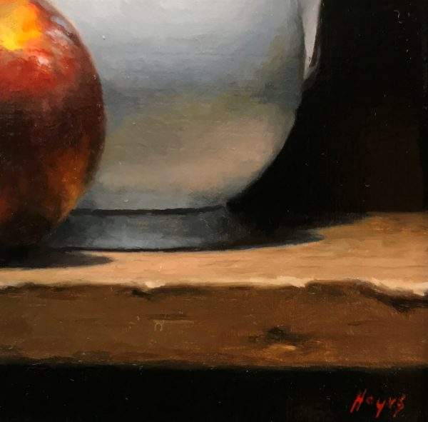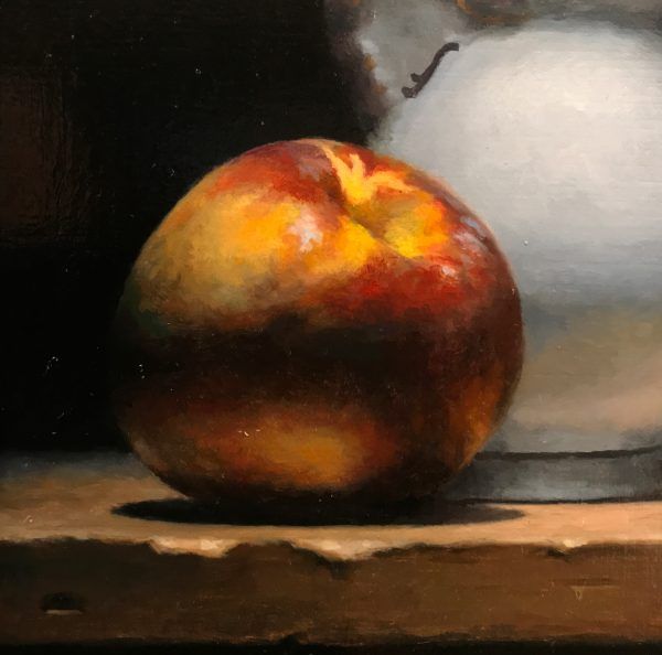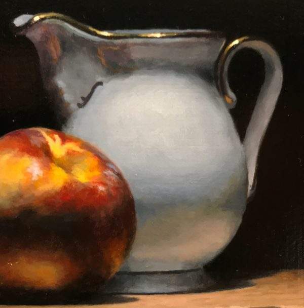 “Nectarine and Creamer” is an original still life painting, done with oil on panel.