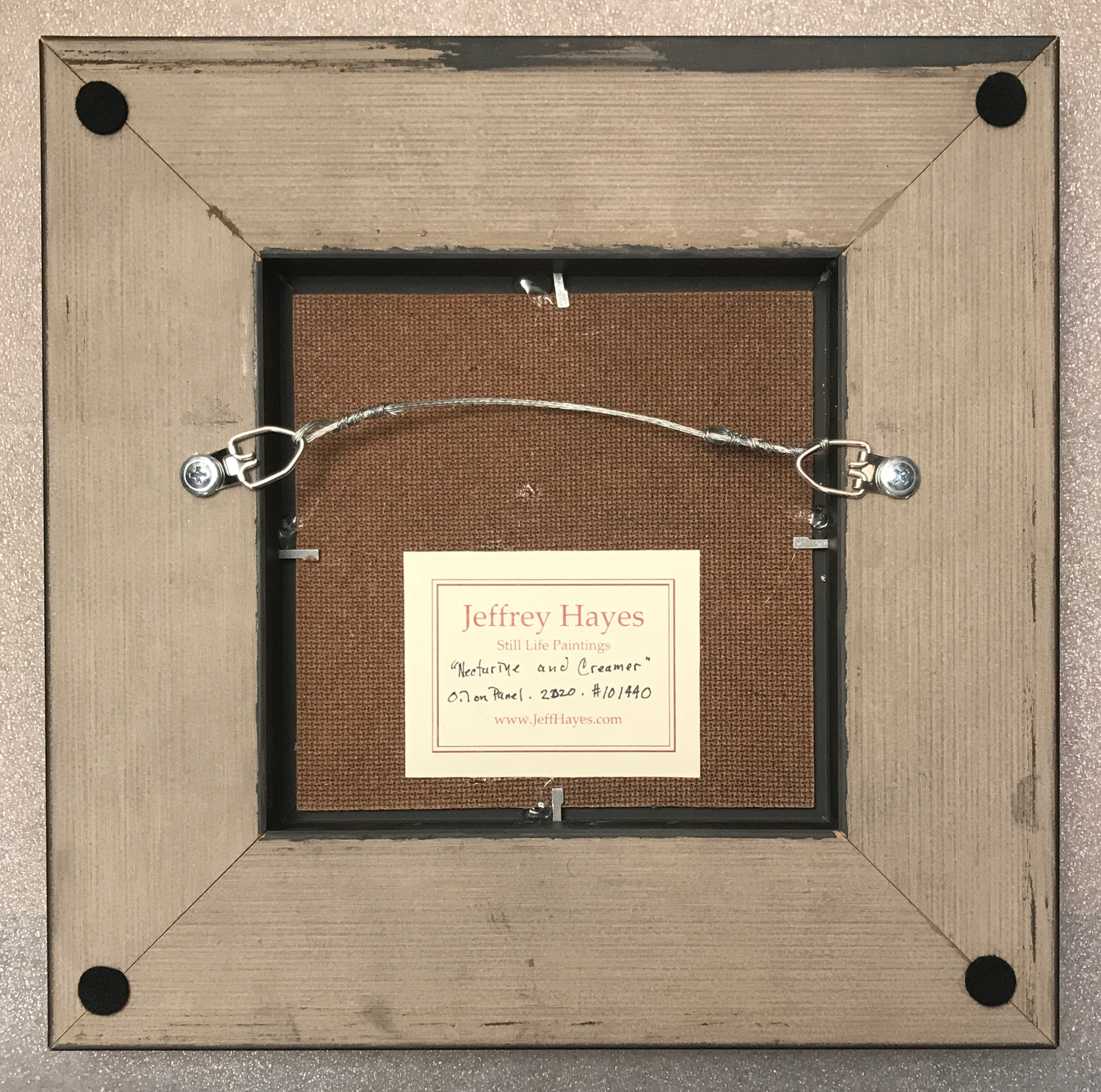 “Nectarine and Creamer” measures 5 x 5 inches (12 x 12 cm), and is presented in a flat panel black frame with a beveled edge. The outer dimensions of the frame are 11 x 11 inches (28 x 28 cm). Felt pads are affixed to each corner of the back of the frame to prevent any damage to your wall and to ensure that the painting rests perfectly parallel to the wall.