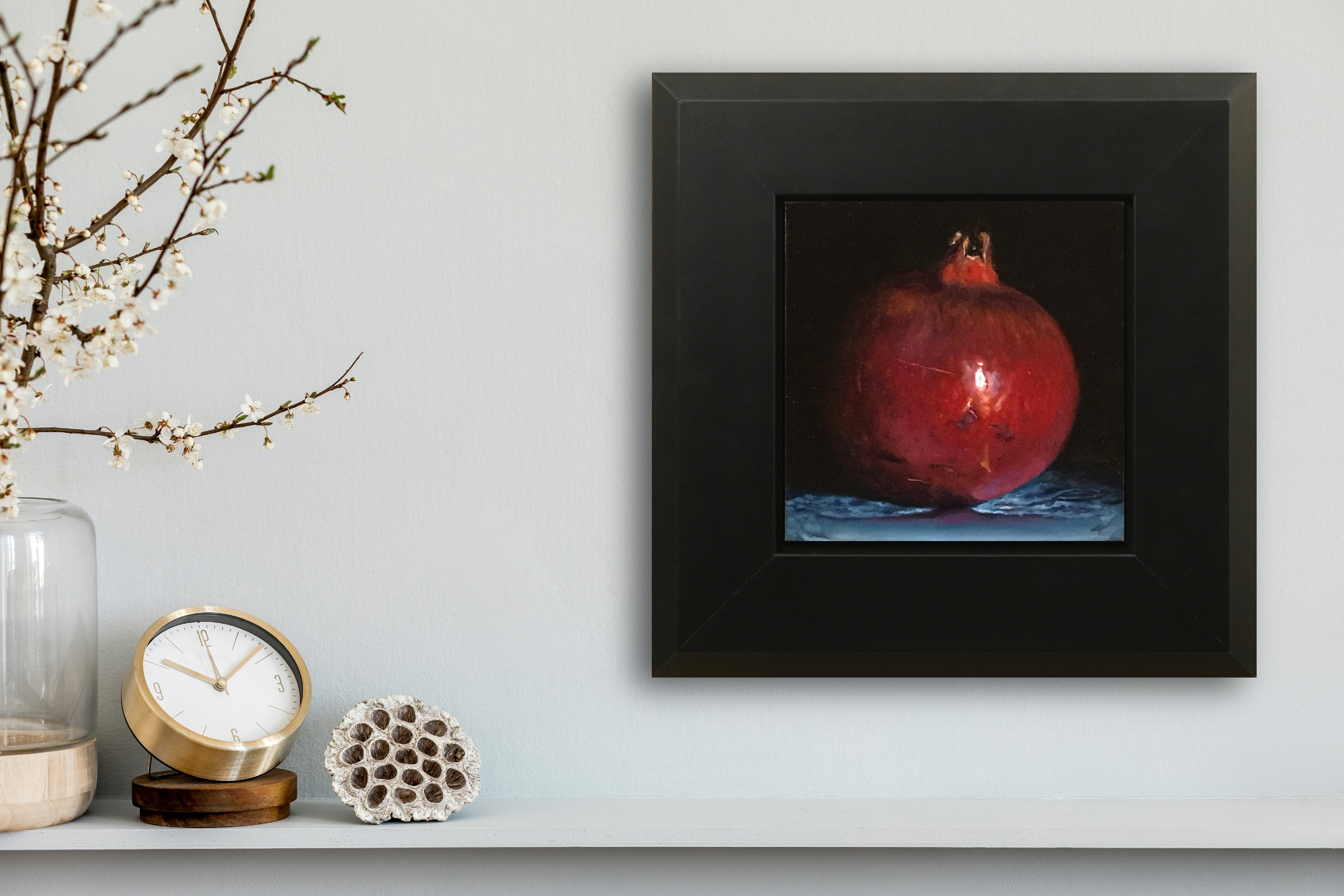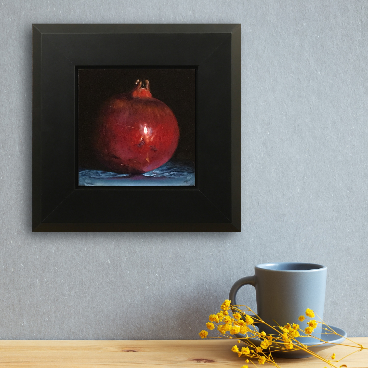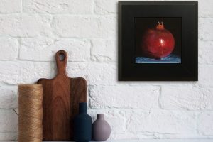 “Pomegranate on Blue Silk” is an original still life painting, done with oil on panel.