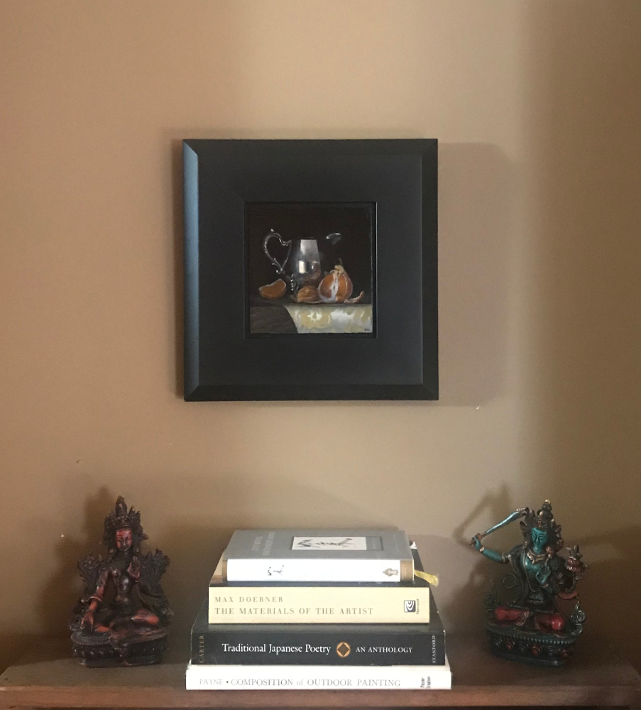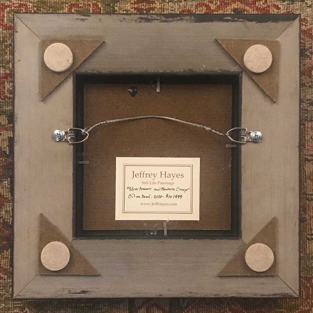 “Silver Creamer and Mandarin Orange” measures 5 x 5 inches (12 x 12 cm), and is presented in a flat panel black frame with a beveled edge. The outer dimensions of the frame are 11 x 11 inches (28 x 28 cm). Felt pads are affixed to each corner of the back of the frame to prevent any damage to your wall and to ensure that the painting rests perfectly parallel to the wall.