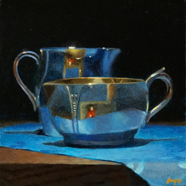 “Silver Creamers on Blue Silk” is an original still life painting, done with oil on panel.
