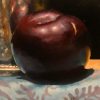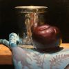 “Silver, Plum, Blue Silk” is an original still life painting, done with oil on panel.