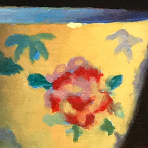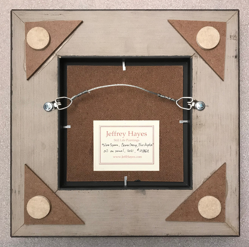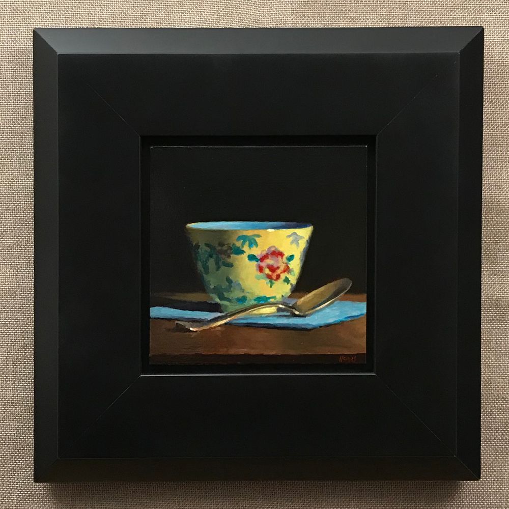 “Silver Spoon, Chinese Teacup, Blue Napkin” measures 5 x 5 inches (12 x 12 cm), and is presented in a flat panel black frame with a beveled edge. The outer dimensions of the frame are 11 x 11 inches (28 x 28 cm). Felt pads are affixed to each corner of the back of the frame to prevent any damage to your wall and to ensure that the painting rests perfectly parallel to the wall.