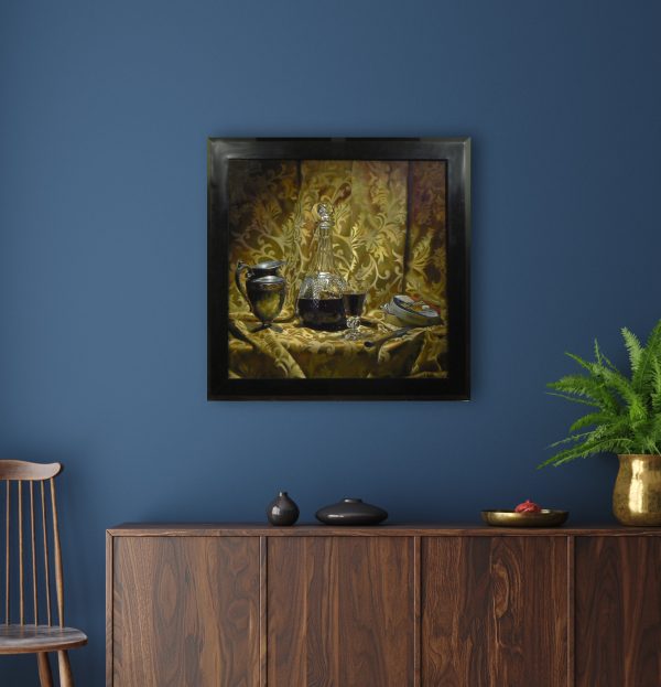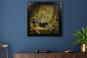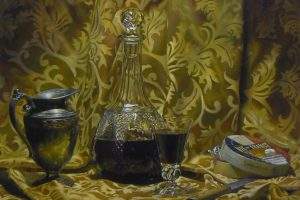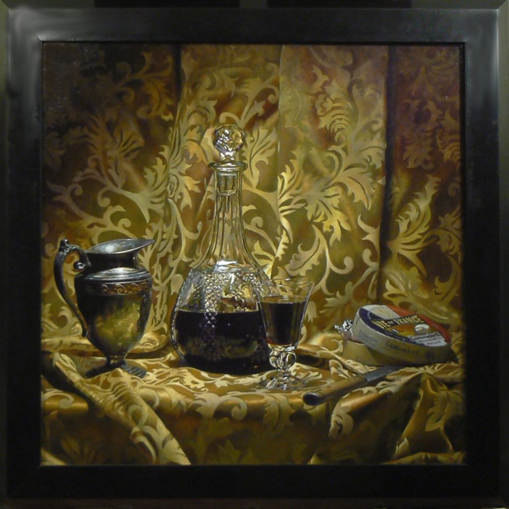 “Silver, Wine, and Cheese” is an original still life painting, done with oil on panel, and measuring 24 x 24 inches.